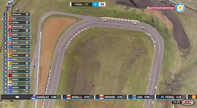 En la largada, todo se mantuvo igual. Castellano picó en punta y dobló primero en la primera variante, por delante de Juan Manuel Silva (Ford). Detrás se ubicaron Julián Santero (Dodge), Gabriel Ponce de León (Ford) y Luis José Di Palma (Torino), quienes le hicieron una luz al resto del pelotón comandado por Juan Pablo Gianini (Ford), con Norberto Fontana (Chevrolet) pegado a la cola.